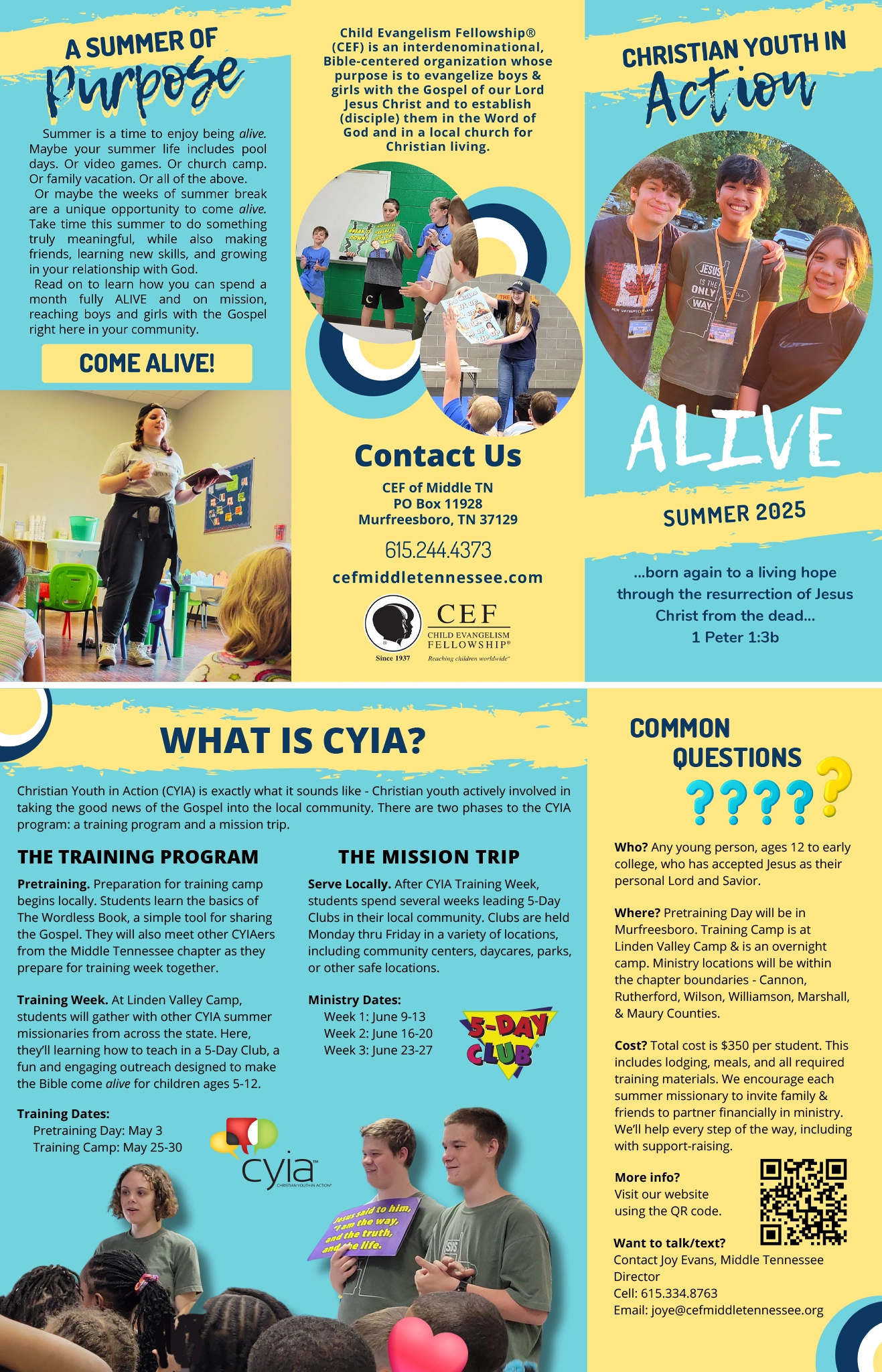 Christian Youth In Action (CYIA) is exactly what it sounds like – Christian youth actively involved in making a difference in the lives of America’s 50 million unchurched children! CYIA is a program designed to train you and a team of other young people in effective and engaging ways to teach children about God. Every year, two-thirds of all children under the age of 14 never attend church or Sunday School. You can make an eternal difference in the lives of these children by serving as a CYIA summer missionary with Child Evangelism Fellowship, leading and teaching 5-Day Clubs. You can watch videos about CYIA at www.cefonline.com/cyia.